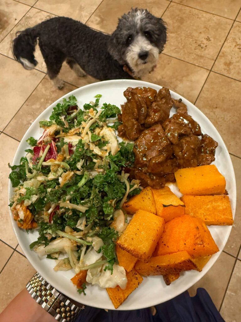 Made these Butcher Box steak tips with butternut squash and salad.. and Maisey ended up eating a ton of the girls’ steak that they left on their plates while we were upstairs. Apparently she was a fan, and she slept like a baby that night haha.
