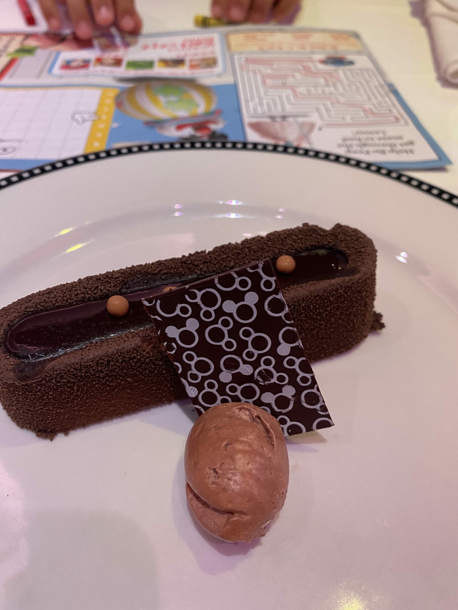 Our favorite is Animator’s Palate, which they have on all of the ships we’ve seen (Dream, Wonder, and Magic). You draw a person on your placemat, and during the meal, they have a *show* in which all of animations come to life on large screens throughout the restaurant, dancing to the music, and added to famous Disney scenes and Disney characters.