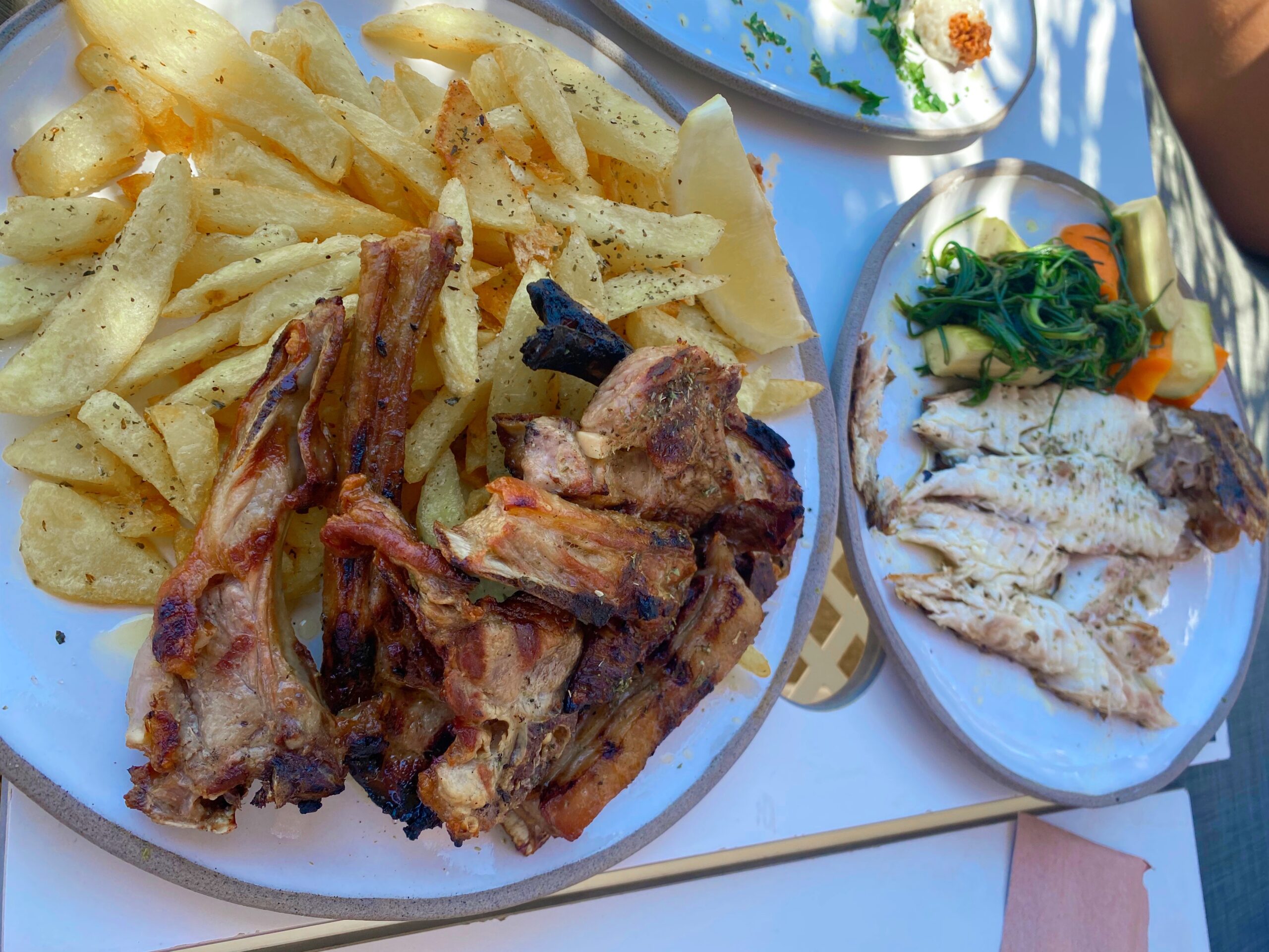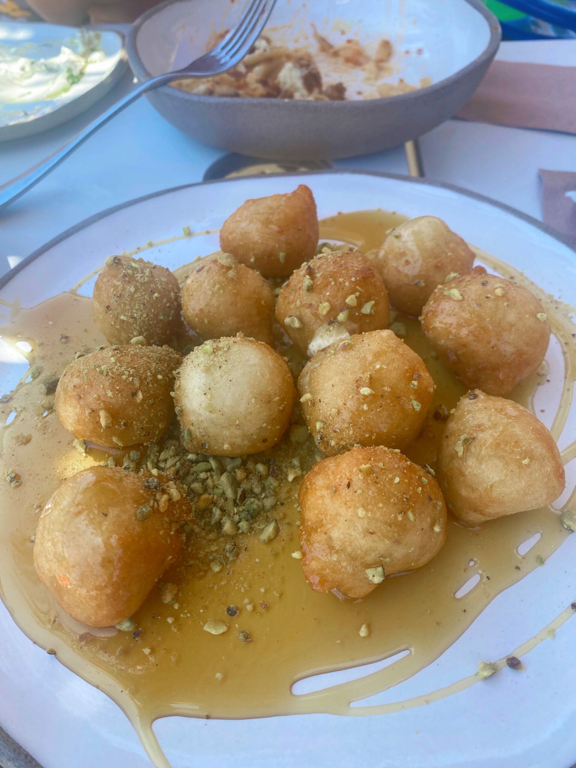 (We also had grilled octopus, salad, cooked garlicky greens, stuffed grape leaves, beef patties, and little doughnuts)