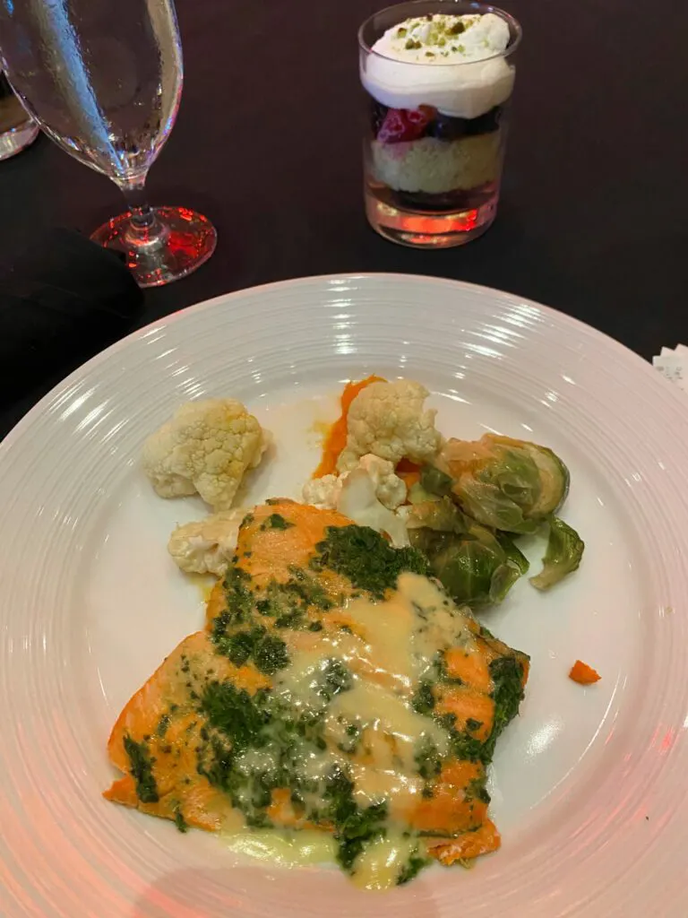 Day 2: wild-caught salmon with an herb sauce, sweet potato puree, veggies, and a mixed berry trifle